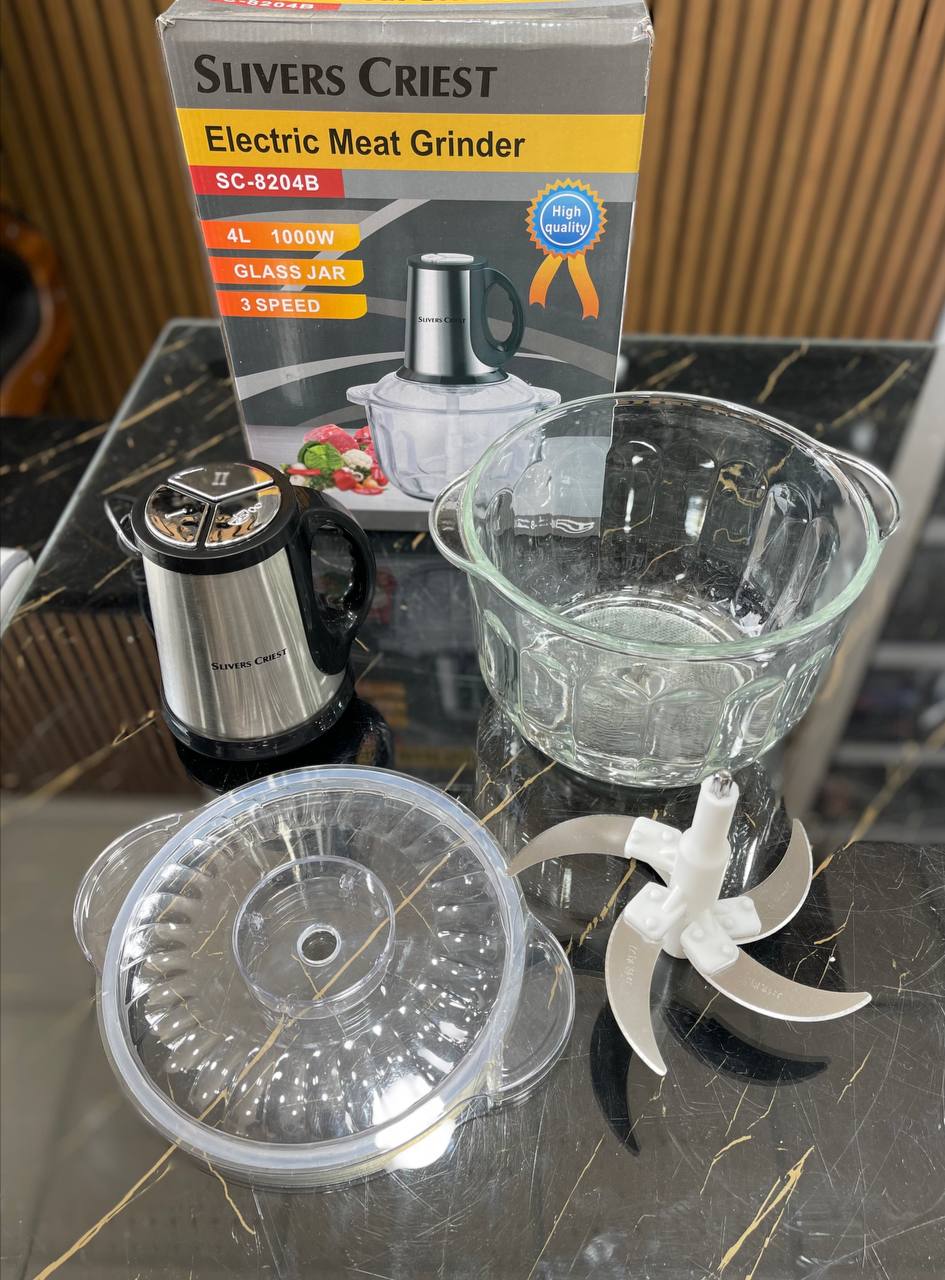 در تصویر یک چرخ گوشت و خردکن برقی SLIVERS CRIEST مدل SC-8204B را داریم. این دستگاه با ظرف شیشهای بزرگ، قابلیت خرد کردن گوشت، سبزیجات و انواع مواد غذایی را به صورت حرفهای، سریع و ساده فراهم میکند. در ادامه اطلاعات کامل و کلمات کلیدی ارائه میشود: